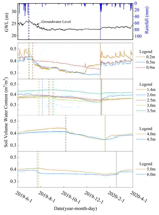 Dynamic changes in soil volume water content in the profile of 3E showed an “increase-decrease-increase-decrease” wave-cycle trend (Figure 2). We divided the wave-cycle trend of soil volume water content into a “dehydration period” and “water absorption period” during the monitoring period. This indicates that water recharge was absorbed in cohesive soil pores during the water absorption period, and water in cohesive soil pores was lost during the dehydration period. Two transition times between the dehydration period and the water absorption period in the cohesive soil layers in the field test site were included from June 2019 to April 2020. Information about transition time, lag time, response time of soil moisture, and groundwater level (GWL) is shown in Table 3 and Figure 4.