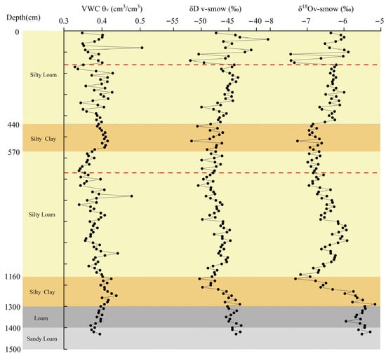 In order to reveal the variation characteristic details of stable isotopes (D, 18O) and soil volume water content in the thick cohesive soil profile to a large extent, the vertical interval of the soil samples was set to 10 cm. It was obvious that the thick cohesive soil profile in the test site can be divided into three zones (0–160 cm, 160–670 cm, and 670–1430 cm), with different variation characteristic details (Figure 6).
