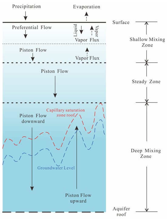 According to the variation characteristics of stable hydrogen and oxygen isotopes in the thick clay soil profile and factors influencing soil moisture migration, the thick cohesive soil profile in the test site can be divided into three zones (Figure 7): the shallow mixing zone, the steady zone, and the deep mixing zone [].