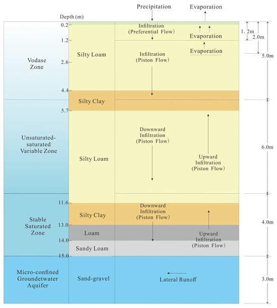 The thick cohesive soil profile was divided into four mass balance zones according to the vertical hydrogeological conceptual model of the field test site (Figure 8). The depth range of the first mass balance zone was 0–200 cm, which belonged to the vadose zone. The change in cohesive soil moisture in this depth range was affected by precipitation and evaporation. Most of the water infiltrated into the vadose zone from precipitation returned back to the atmosphere by evaporation; only a small percentage of water was effective and recharged the cohesive soil moisture in the vadose zone []. The depth range of the second mass balance zone was 200–500 cm, which belonged to the vadose zone. Water flux at the depth of 200 cm was the effective infiltration recharge from precipitation to soil water in the vadose zone. Water flux at the depth of 500 cm was the sum of the effective recharge from precipitation infiltration and the water release of cohesive soil in the vadose zone at the depth range of 200–500 cm. The depth range of the third mass balance zone was 500–1100 cm, also called the unsaturated–saturated variable zone. It can be considered that the micro-confined groundwater had been recharged when it arrived at this zone, and the water flux at the bottom of this mass balance zone was the actual recharge to the micro-confined groundwater when the soil moisture migrated to the bottom of this zone. The depth range of the fourth mass balance zone was 1100–1500 cm, which was a stable saturated zone of micro-confined groundwater. Water flux at the bottom of this mass balance zone was the exchange capacity of soil water–groundwater.