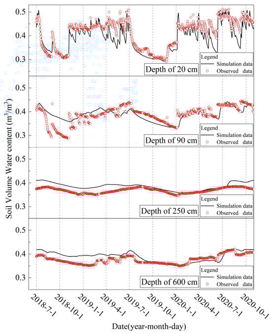 The initial values of the fitted parameters (Table 4) for each layer were estimated using the Neural Network Prediction embedded in the model, and then, the parameters were fitted by fitting the observations measured for this layer in the field test site. We compared observed field measurements with the results of the HYDRUS-1D simulations using the mean absolute errors (MAEs) and root mean square errors (RMSEs) shown in Table 5 [,]. The average value of the simulation data is very close to the average value of observed data at each layer. The values of MAE and RMSE of these four layers are small and close to 0, which means the accuracies of model calibration and validation are good. The observed field measurements and simulation results of the four cohesive layers in the three mass balance zones were roughly the same (Figure 9). The difference between simulation data and observed data (|Oi − Pi|max) was larger at the depth of 0.2 m than at 0.9 m, followed by that at 6.0 m and 2.5 m. The numerical model can generally simulate the variation in soil water content in cohesive soil. The parameters of the Van Genuchten–Mualem equation were finally determined after multiple hydraulic parameter adjustments. The optimization results are presented in Table 6.