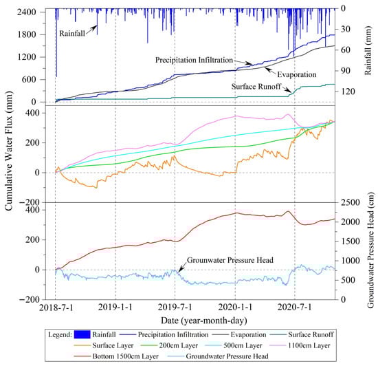 Surface runoff could be formed when the rainfall was greater than 25 mm/d, which was mainly formed in the wet season from June to July. The cumulative rainfall was 1684 mm during two hydrological years, from 1 July 2018 to 30 June 2020. The cumulative surface runoff which discharged out to surface water was 272 mm (16.15%). The cumulative rainfall infiltration was 1382 mm (82.07%), but most of the rainfall infiltration returned back to the atmosphere by evaporation, having accumulated to 1190 mm, accounting for 70.67% (Figure 10). The cumulative water flux of the clay layer at the depth of 200 cm reflected the effective precipitation infiltration recharge that could be totally absorbed in the cohesive soil and finally recharged to the groundwater after removing the water amount of evaporation. Due to the low permeability coefficient of cohesive soil in the test site and the long recharge path, there was an obvious lag effect on precipitation infiltration recharge to the micro-confined groundwater aquifer.