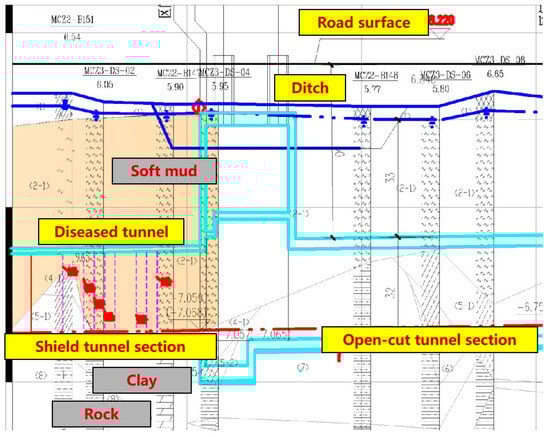 The subway tunnel in Guangzhou is located in a typical upper soft and lower hard stratum, as shown in Figure 1. Most of the tunnel body is positioned within silt and silty soil, while the base of the tunnel rests in a comparatively hard residual soil layer. Above the tunnel, an intercity expressway has undergone multiple reclamation processes due to uneven settlement of the soft soil. This has caused continuous consolidation and settlement of the silt layer and an amplified soil weight over the tunnel, inducing significant lateral deformation. The soft silt layer struggles to provide sufficient lateral support for the shield tunnel structure, which leads to excessive lateral deformation. Such distortion in shield tunnels frequently results in joint leakage and even structural issues such as tunnel concrete segment cracking and collapse, compromising the structural integrity and safety of passing trains.