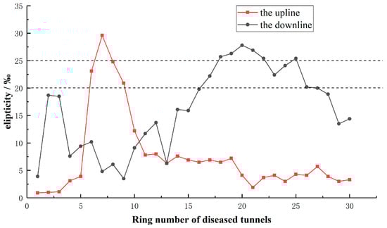 Ellipticity is derived from the tunnel’s deformed short and long axes and is typically determined by the difference between a tunnel’s maximum and minimum diameters and its designed internal diameter, expressed in thousandths as a ratio. Since limited research currently exists on the lateral deformation limit of relevant tunnels based on ellipticity, engineering experience generally sets this threshold at 25‰. The latest monitoring results prior to reinforcement measures are presented in Figure 3.