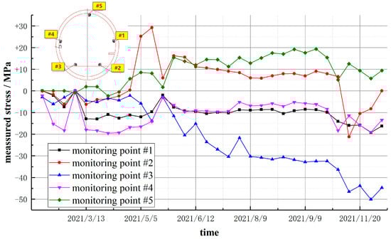 In response to these findings, the relevant departments initiated a special reinforcement project. The specific steel plate reinforcement method for the affected tunnel includes the following steps: firstly, repairing the tunnel segment cracks in the tunnel; secondly, pasting aramid fiber cloth to the cracks, ensuring joint stress between the shield tunnel segment and the aramid fibers; and lastly, introducing an additional steel plate inside the tunnel as a structural reinforcement measure, enabling the combination of the steel plate and the shield tunnel segment to establish a composite structure. In order to guarantee the tunnel’s structural integrity during the routine operation of the reinforced tunnel, it is imperative to periodically monitor the deformation and internal forces of the reinforced composite structure. Due to space limitations, only the results from ring No. 7 of the upstream line, which exhibits the highest ellipticity and most significant damage, are displayed. High-precision vibrating string surface strain gauges facilitate this monitoring, with stress-strain monitoring points positioned in five directions within each tunnel ring section. The variations in internal force at each point within the reinforced composite structure of ring No. 7 over time are depicted in Figure 5.