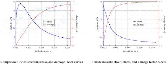 where E0 is the initial modulus of elasticity of the material and dk is the concrete damage factor, which can be expressed as the damage parameter of concrete in tension or compression, respectively.