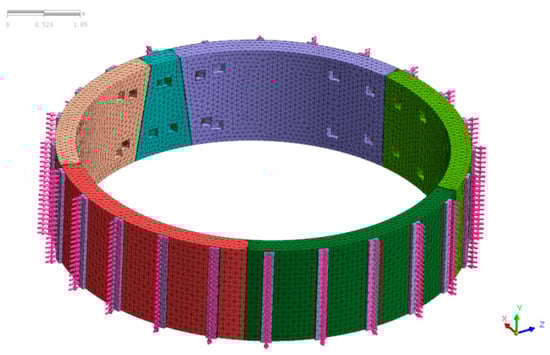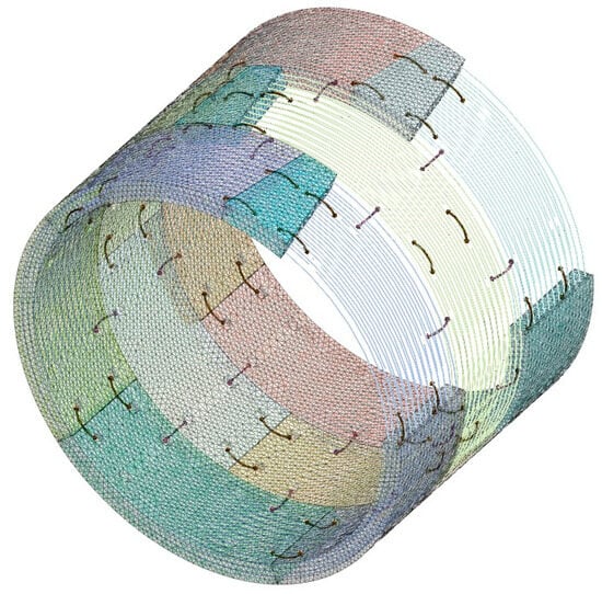 The model incorporates three-dimensional curved bolts and bolt handholes to simulate the contact relationship between concrete segments, bolts, and handholes. The size and relative positioning derive from construction design drawings. To reflect the yielding behavior of the steel, the Von Mises eigenstructure is used for the connecting bolts. The yield strength of 5.8-grade bolts used in this model is taken as 400 MPa, and the ultimate strength is taken as 500 MPa. The contact points between adjacent segments, bolts, and tunnel segments employ a surface-to-surface contact model. This model enforces hard contact in the normal direction, allowing pressure transfer and separation post-contact, and the tangential direction is modeled using the Coulomb friction method based on the penalty function approach. The finite-element model is shown in Figure 7.