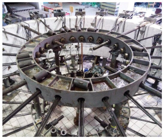 Given the intricacies of actual engineering challenges, it is suggested to use the convergence of the tunnel’s vertical and lateral deformation from real monitoring data as the target for the numerical simulation of the shield tunnel structure. This involves incrementally increasing vertical pressure while maintaining lateral pressure at 0.5 times the vertical pressure, subsequently analyzing the tunnel structure’s safety under specific ellipticity while ensuring a reasonable load state. Based on the model calibration from the literature [24], the shield tunnel undergoes modeling and analysis. Model parameters are adjusted dynamically, comparing results such as internal force, convergence deformation, and concrete cracking to foot-scale test models. This process confirms the accuracy and applicability of the developed finite-element model and provides essential model parameters for further simulation and analysis. The full-scale model test of a shield segment in the literature [24] is shown in Figure 8, and the schematic diagram of the loading of the validation model in Figure 9.