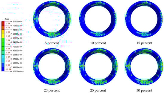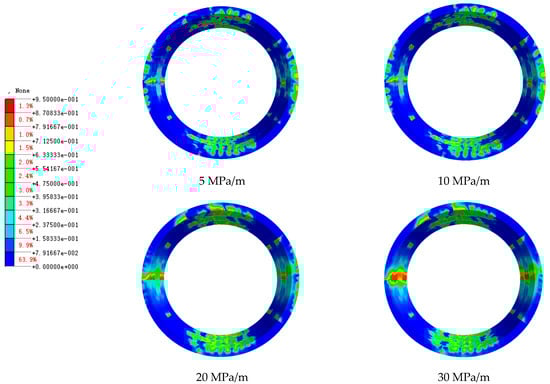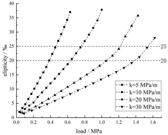 Figure 14 depicts the damage cloud diagram for each scenario at an ellipticity of 25‰. With smaller k values, the red region in the arch waist is minimized, indicating lesser damage and the structure’s ability to bear the normal load. Conversely, larger k values lead to pronounced damage in the arch waist. Comparing this with the loading curve reveals that the structure is almost in the yielding phase.