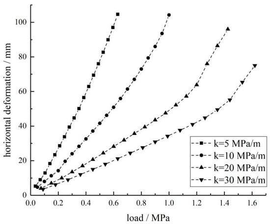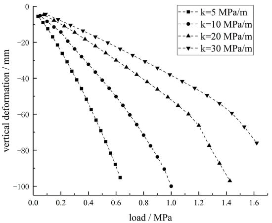 Figure 11, Figure 12 and Figure 13 show that a critical distinction between the algorithms is the overall yield point of the structure during loading. Analyzing the loading-deformation curve, a significant slope change in the curve indicates a decrease in the loaded stiffness, implying that the entire ring structure is in the yielding stage. For a k value of 5, 10, 20, and 30 MPa/m, the yielding begins when horizontal convergence reaches roughly 90, 80, 70, and 60 mm, respectively.