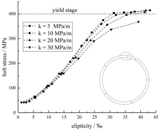 The Guangzhou subway tunnel, as discussed in this study, employs 5.8-grade high-strength bolts with a yield strength of approximately 400 MPa. Figure 15 shows that when the ellipticity approaches 30‰, the bolts at the joints with the most significant deformation begin to yield. After the bolts at the top joints yield, the connecting bolts at the waist-part joints also enter the yielding stage as deformation increases. Through loading simulation, for soft soil regions, tunnel segment deformation primarily arises from joint deformation. The connecting bolts might yield tension due to the excessive opening of the tunnel segment joints. Conversely, in hard rock areas with significant stratigraphic restriction, tunnel segment joint deformation is minimal. Deformation mainly results from the softening and cracking of the concrete tunnel segment, and the bolts are less likely to experience substantial stresses. The discrepancy in bolt stress under varied surrounding rock conditions might not be stark, but it does illustrate the deformation characteristics of the shield tunnel structure.