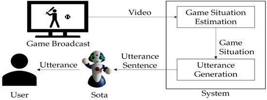 In this section, we propose a method for supporting novice baseball spectators in watching games using robots. The proposed method involves a robot watching a baseball game alongside a human while making appropriate utterances depending on the game situation. Figure 1 shows an overview of the robot that supports baseball spectating, Sota, which was developed by Vstone. Sota’s size and functionality are sufficient to realize our proposed method. Although a similar robot, NAO, exists, it has a walking function and is larger than Sota. Our proposed method does not require the robot to walk. In addition, it is desirable to use a small robot considering the cost associated with the robot’s installation space. The system generates a sentence based on the estimated game situation from a live game video and the robot delivers the utterance. To create an atmosphere of shared spectating, the robot supports the same team as the user.