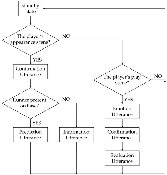 Figure 2 shows a flowchart of the utterance rules. The robot waited and selected an appropriate utterance category for the scene depending on the game situation changes. In baseball, the player’s appearance and play scenes are repeated; thus, utterances based on rules 1, 2, and 3 are generally repeated.