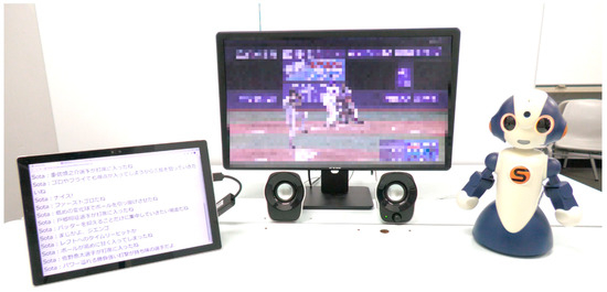 The experimental setup is shown in Figure 3. The robot used for the experiment was Sota, from Vstone (shown in the lower-right corner of Figure 3). The baseball video was shown on a display (located in the upper center of Figure 3). To eliminate the possibility that participants could not hear the robot’s spoken utterances, which may include baseball-related terms and player names, the utterance sentence [5] was displayed on Microsoft’s Surface Pro 4 (located in the lower-left corner of Figure 3).
