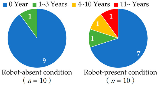 The results of the participants’ spectator experiences, as reported in the questionnaire before the experiment, are summarized in Figure 4. In the robot-absent condition, nine participants had no prior experience, whereas one participant had 1–3 years of experience. In the robot-present condition, seven participants had no prior experience, one participant had 1–3 years of experience, one participant had 4–10 years of experience, and one participant had over 11 years of experience. Although two participants in the robot-present condition had more experience, most participants in both conditions had little to no experience playing baseball.