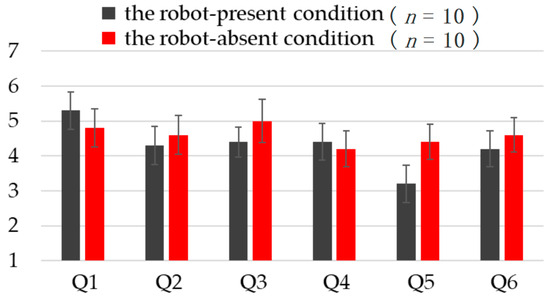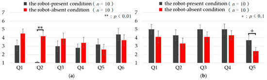 The results of the evaluation of the six items for individual gameplay intelligence and cognitive ability are shown in Figure 5a. The evaluation values were obtained using a range of 1–7, with “1. Not at all” and “7. Did it a lot.” We compared the average ratings for each item between the conditions. To confirm the significance of the differences in the ratings between conditions, we performed a non-parametric test without correspondence using the Mann–Whitney U test. The Mann-Whitney U test is one of the most frequently used nonparametric tests for evaluating the difference of medians between two independent samples [38,39]. The test confirmed that the item “watching while knowing the strengths of the player” had significantly higher ratings (p < 0.01) in the condition with the robot present than in the robot-absent condition. No significant differences were found for the other items. In this study, statistical significance is recognized when p < 0.05. A significance level of p < 0.01 corresponds to a 1% level of significance. When p < 0.1, although statistical significance is not observed, we discuss the results as potentially providing valuable insights.