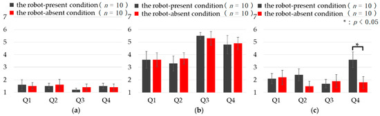 The evaluation results for the five items on psychological empathy are shown in Figure 5b. Similarly, a Mann–Whitney U test was performed, and the item “watching while empathizing with the player’s anger” showed a tendency to be significantly higher (p < 0.1) in the robot-absent condition than in the robot-present condition. No significant differences were found for the other items.