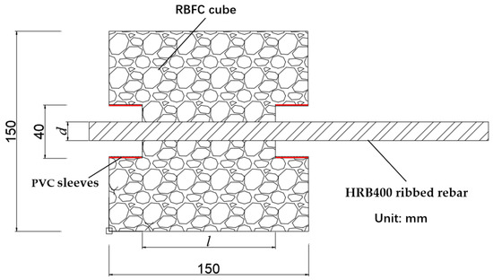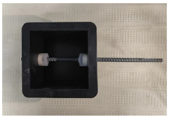 In this study, specimens with dimensions of 150 mm × 150 mm × 150 mm were designed according to the Chinese Standard GB 50152-2012 [34]. A dimensional concept of a cubic specimen is shown in Figure 1. The test mold was made, as shown in Figure 2. The rebar was HRB400 ribbed rebar with bonding lengths of 60 mm, 80 mm, and 100 mm. Polyvinyl chloride (PVC) tubes with a diameter of 40 mm filled with Styrofoam were used in unbonding sections with pre-built lengths of 45 mm, 35 mm, and 25 mm.