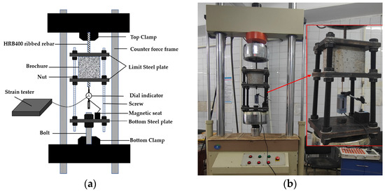 A 200 kN electro-hydraulic servo fatigue testing machine (MTS) was selected as the test apparatus, as shown in Figure 3a. The test apparatus was controlled by a computer numerical control system, and the load was output from it. The displacement data of the free end were measured using a displacement meter, as shown in Figure 3b. During the experiments, the lower collet of the MTS clamped and fixed the 30 mm diameter high-tensile-strength bolts to the lower part of the bracket while the specimen was placed on the upper part of the bracket. The rebar was clamped through pre-drilled holes in the top clamp, and a loading rate of 1.2 mm/min was set.
