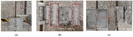 Figure 4. Typical specimens with different damage forms. (a) Rebar pull-off damage. (b) Pull-out damage. (c) Splitting damage.