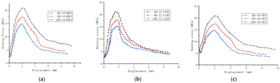 Figure 5. Bond stress–slip curves of each group. (a) 14-RBFC. (b) 12-CCRC. (c) 16-BFC.
