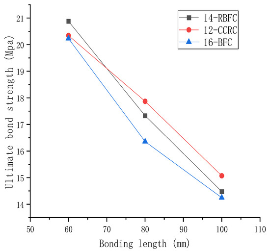As shown in Figure 5, the effects of bonding lengths on the bond strength of rebar with different concrete types were all relatively obvious, which was also reflected in the specimens with different rebar diameters. For the three groups of specimens with different concrete types and rebar diameters, the bond strengths decreased nearly linearly with decreasing bonding lengths, as shown in Figure 6. When the bonding lengths of the specimens were in a wide range of 60–100 mm, the ultimate bond strength ( τ u ) decreased by an average of 13.91–16.72% for every 20 mm increase in bonding length. Therefore, in this range, increasing the bonding length had a negative effect on the bond strength between rebar and concrete.