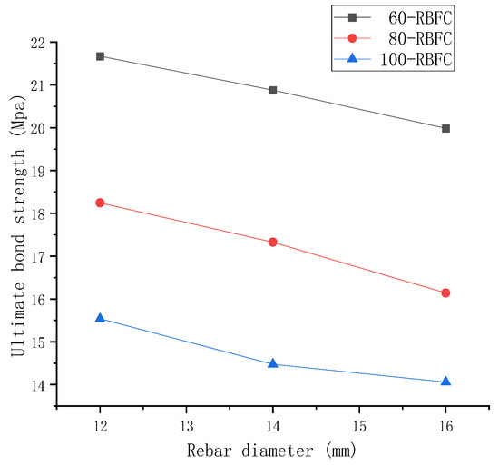 In the center pull-out tests, the bond stresses in specimens with the same rebar diameter for RBFC decreased by 13.91–16.72% for every 20 mm increase in bonding length in the range from 60 to 100 mm. The ultimate bond strength ( τ u ) decreased by 3.96–5.94% for every 2 mm increase in rebar diameter for the same bonding length in the 12 to 16 mm diameter range.