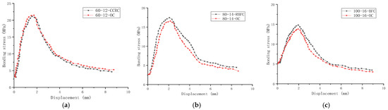 Figure 8. Bond stress–slip curves of each group: (a) 60-12-CCRC and OC, (b) 80-14-RBFC and OC, and (c) 100-16-BFC and OC.