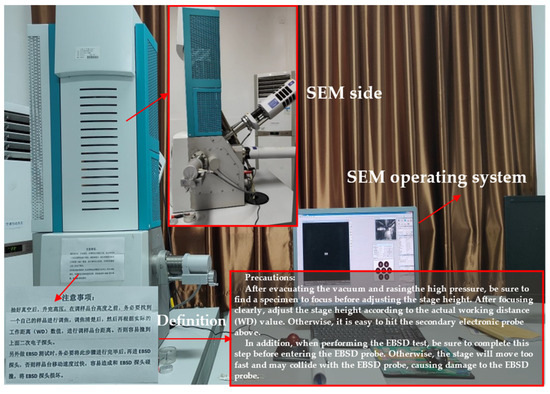 The microstructure of the interface between rubber granules, basalt fibers, and concrete can be studied to explain the experimental phenomena of variations in their effect on the bond strength of concrete. Figure 9 shows a detailed view of an RBFC specimen with pull-out damage. It can be seen that the concrete in front of the rib is crushed and adheres to the rib in front of the rebar. Typical areas of the concrete where the pull-out damage occurred were sampled, and the specimens were microscopically analyzed using a tungsten filament scanning electron microscope (SEM), as shown in Figure 10.