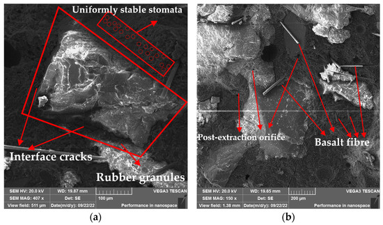 The microscopic characteristics of the interface between rubber granules, basalt fibers, and concrete are shown in Figure 11. From Figure 11a, it can be seen that the interface cracks between the rubber granules and the cement stones are more pronounced, and there are obvious flaws. This is because a rubber granule is a water-repellent waterproof material that has different properties than a cement stone. When the hydration reaction of cement occurs to produce cement stone, the rubber granules do not form a strong bond with the cement stone, so the bond strength is reduced. It is also due to its hydrophobicity, which significantly reduces the surface tension of water [38]. Its hydrophobicity allows the concrete to introduce uniform, stable, and fine air bubbles around the rubber granules during the mixing process. These closed-cell air bubbles reduce the bond strength, and the number of capillaries allows them to improve the frost resistance, toughness, and impact resistance of the concrete. From Figure 11b, it can be seen that the fibers are uniformly distributed within the cement paste and had a good hydration reaction with the cement stone, resulting in the fibers being firmly embedded within the cement stone. When the concrete is subjected to external forces that cause microcracking, the presence of fibers can effectively inhibit the development of microcracking. In addition, the fibers can alleviate the tendency to develop into larger cracks under pressure and act as anchors during the development of microcracks. To some extent, this increases the compressive strength and enhances the bond strength.