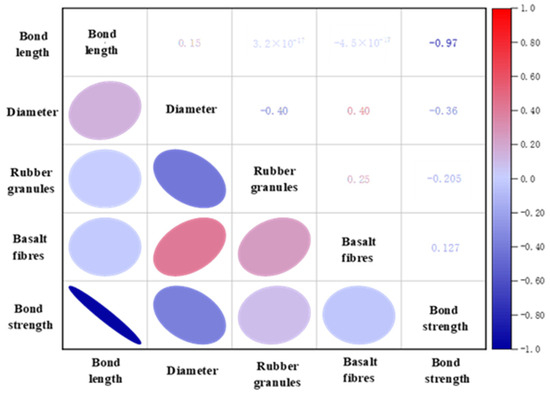 Pearson’s correlation coefficients of bonding length, rebar diameter, and whether the appropriate amounts of rubber granules and basalt fibers were used are shown in Figure 12 as bonding length (−0.97, extremely strong), rebar diameter (−0.36, weak), mixed with 10% rubber granules (−0.205, weak), and mixed with 4.56 kg/m3 basalt fiber (0.127, extremely weak). Therefore, the order of the sensitivity of these four factors to the bond strength, from the smallest to the largest, is bonding length (−0.97), rebar diameter (−0.36), mixed with 10% rubber granules (−0.205), and mixed with 4.56 kg/m3 basalt fibers (0.127). The results also indicate that the first three factors are negatively correlated with bond strength. This conclusion is consistent with the results in Section 3.3.1, Section 3.3.2 and Section 3.3.3.