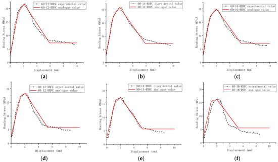 As shown in Figure 15, the bond stress–slip curves of the simulated and test values fit well. In particular, there was a high degree of overlap for the rising and slipping sections of the stress–slip curves. It is shown that the bond stress–slip curve obtained by fitting the test data can characterize the bonding properties between the deformed rebar and the RBFC.