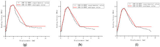 Figure 15. Comparisons of experimental and analog values of bond stress–slip curves: (a) 60-12-RBFC, (b) 60-14-RBFC, (c) 60-16-RBFC, (d) 80-12-RBFC, (e) 80-14-RBFC, (f) 80-16-RBFC, (g) 100-12-RBFC, (h) 100-14-RBFC, and (i) 100-16-RBFC.