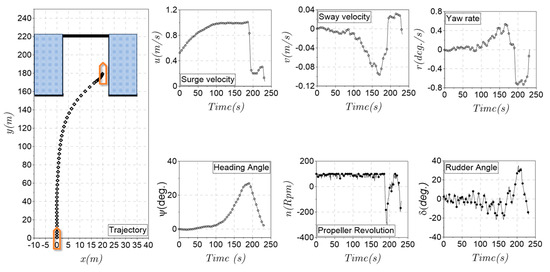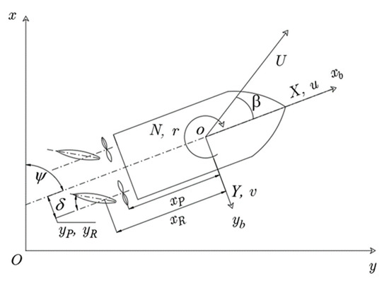 where is the mass of the ship; is the longitudinal position of the center of gravity of the ship; denote the surge, sway, and yaw velocities, respectively; the symbol “” in the head of the variable denotes the derivative of the variable with respect to time; is the moment representing the mass moment of inertia with respect to the z-axis; , ,