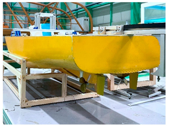 Previous studies were carried out by research groups at Changwon National University on hydrodynamic properties under operating conditions [19]. Experiments were conducted on the Korean autonomous surface ship (KASS) model, a ship model used in the project carried out by many universities and research institutes to develop autonomous ships. The main characteristics and the shape of the ship’s model are shown in Table 1 and Figure 2 The cross-comparison of the results between the previous studies and [20] shows similarities in the results. Figure 3 shows the comparison results of the turning maneuverability at a rudder angle of 35 degrees at three and six knots. Similarly, in order to obtain the feasible path for the automatic berthing task, the high-accuracy equation of motion and hydrodynamic coefficients of the USV should be investigated carefully using the Korean autonomous surface ship (KASS) model. In this paper, the hydrodynamic coefficients were estimated using the captive model test at Changwon National University and compared with the CFD method as presented in [21]. The coefficients relative to only the surge velocity were estimated through the resistance test. The hydrodynamic coefficients related to surge and sway velocity for forces and moments were estimated through a static drift test. The hydrodynamic coefficients related to the yaw rate were estimated using the circular motion test and the hydrodynamic coefficients related to the combined effect of sway velocity and yaw rate were estimated using the combined circular motion with drift test. The added mass and interaction coefficients were selected from [21]. The summary of hydrodynamics and interaction coefficients are shown in Table 2 and Table 3.