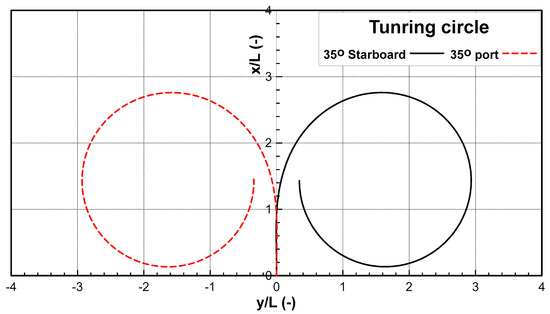 Simulation results of turning trajectories at a rudder angle of 35 degrees.