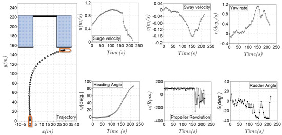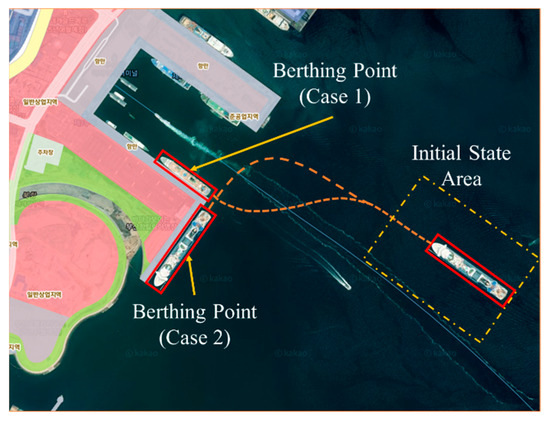 Case 1: Parallel berthing task in a 30.5 × 202 m water area. In this case, the ship’s initial states were generated randomly, as described in Table 6. The berthing point was assumed, as shown in Table 7. The berthing task can be considered a success if the ship state is in the range of the values described in Table 7. The boundary area is described as a Figure 8a and Table 8.