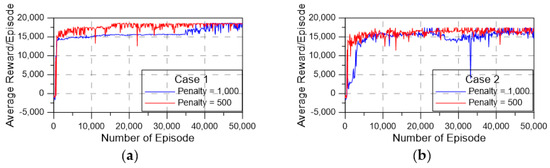 - Agent: The hyperparameters for the TD3 model were selected as follows: the number of hidden layers was set as two layers with 512 units for each. The learning rate for the actor and critic networks α and β was set to 0.0001. The discount factor was 0.99. The soft update coefficient was 0.005. The batch size was 128. This training process was set to 20,000/50,000 steps for the warmup of the model with the exploration noise set in Table 5.
