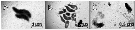 Transmission electron microscopy images of Campylobacter jejuni NCTC 11168 of samples not treated (A) and treated with fir honeydew honey at concentrations of 12.5 mg/mL [1× minimal inhibitory concentration (MIC)] (B) and 25 mg/mL (2× MIC) (C). Samples were scanned after 24 h of incubation at 42 °C in microaerobic atmosphere in Ringer solution, where fir honeydew honey was not (A) or was added (B,C).