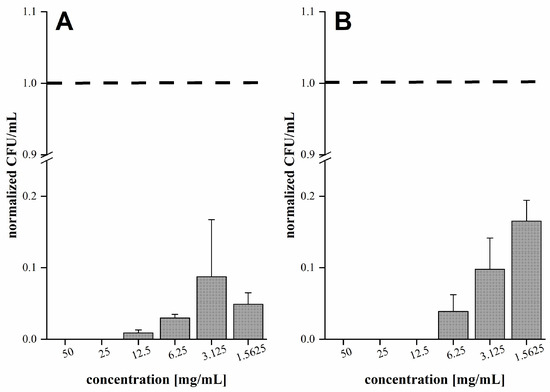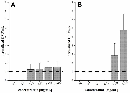 Normalised adhesion of Campylobacter jejuni K49/4 to polystyrene surface after 24 h incubation in Mueller Hinton (MH) broth (A) and milk (B) under microaerobic atmosphere at 42 °C. Cells were exposed to fir honeydew honey at a concentration from 1.5625 to 50 mg/mL The adhered cells in the microtiter plates were suspended in phosphate buffered saline (PBS) via ultrasonic bath and their concentration was determined via the plate counting method. The CFU is given per mL of PBS. Normalised mean values (control = 1) + standard deviation are given.