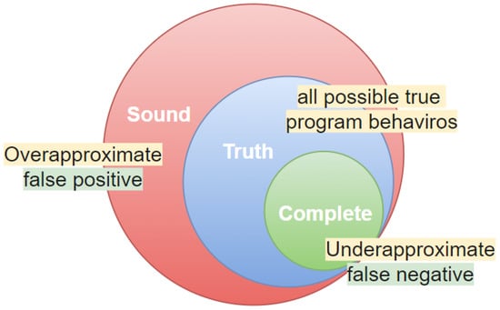 According to Rice’s theorem [42], any nontrivial property of a language recognized by a Turing machine is undecidable. This means that a program can be considered a function that maps inputs to outputs, and there is no generic algorithm that can detect the non-trivial properties (i.e., properties that are not true or false for all programs) of this function. Therefore, there is no perfect static analysis that addresses all safety issues. In the static analysis process, there is inevitably sound and complete behavior [43], as shown in Figure 1. Thus, the existing Rust static analysis tools [36,37,38] all suffer from false negatives and false positives.