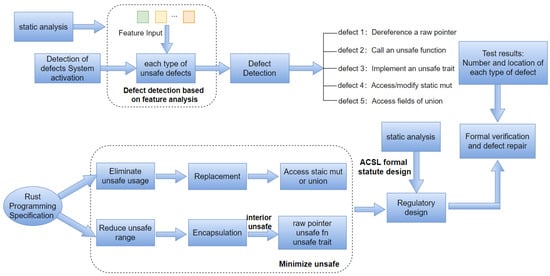 To reduce the vulnerabilities caused by unsafe fragments, researchers have conducted various studies, including code suggestions/specifications [15,25,26], formal verification [27,28,29], fuzzy testing [30,31,32], symbolic execution [33,34,35], and static analysis [36,37,38].