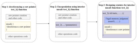 In general, it is safe to create a raw pointer but unsafe to dereference it. The reason for this is that there is no way to guarantee memory safety. To address this problem, Thetis automates the process of locating code corresponding to operations that dereferenced raw pointers to adjust the structure of unsafe fragments through Interior Unsafe encapsulation. An encapsulated function is shown in Step 2 in Figure 4.