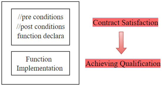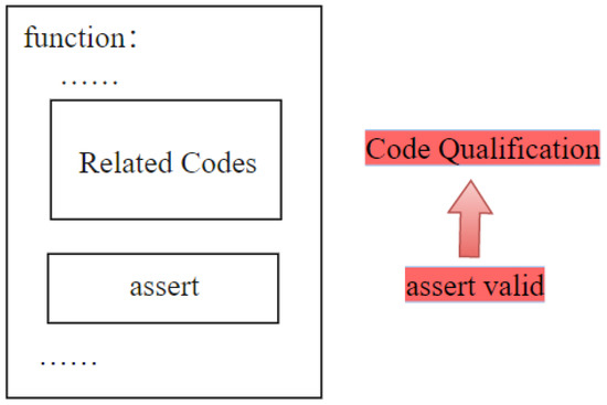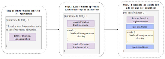 Based on principles 2 and 3, Thetis takes measures to encapsulate and validate unsafe functions and trait code. The method relies on the Interior Unsafe concept. It adjusts the scope of the vulnerabilities in functions and then replaces them with an Interior Unsafe block, as shown in Step 2 in Figure 6. This method efficiently reduces the scope of the vulnerabilities and makes it easier to check for them. With the scope of the vulnerabilities reduced, the process of improving and verifying safety is further simplified. Additionally, for some Interior Unsafe functions, the safety depends on the input and the execution environment [26] so it is essential to describe the context. ACSL provides a function contract design to verify the legitimacy of the code [47,48], which is expressed as a Hoare logic expression ({pre-condition} function body {post-condition}), as shown in Figure 7. Thetis annotates function calls with appropriate pre- and post-conditions for Interior Unsafe functions according to the verification logic. The assert is used not only to check whether the state provided by the current calling environment is satisfied but also to detect the return status of the function indicated by the post-conditions if the pre-conditions are satisfied. If the function passes the detection of the pre- and post-conditions, the correctness and safety of the scheduled process will be ensured.
