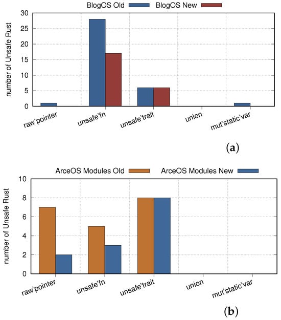 Since a union is not used in BlogOS and ArcoOS, the processing is not described here. We checked the repaired system again and compared it to the original one. The number of unsafe operations changed, as shown in Figure 8.