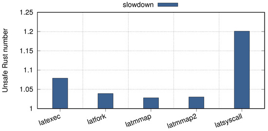 In order to accurately measure these overheads, this section utilizes LMbench [61] to test the Rust system (specifically, the rCore system [62]) before and after defect elimination. The test results, as shown in Figure 9, demonstrate that the overall performance decreases by approximately 1.076%, maintaining the high-performance characteristics of the Rust system.