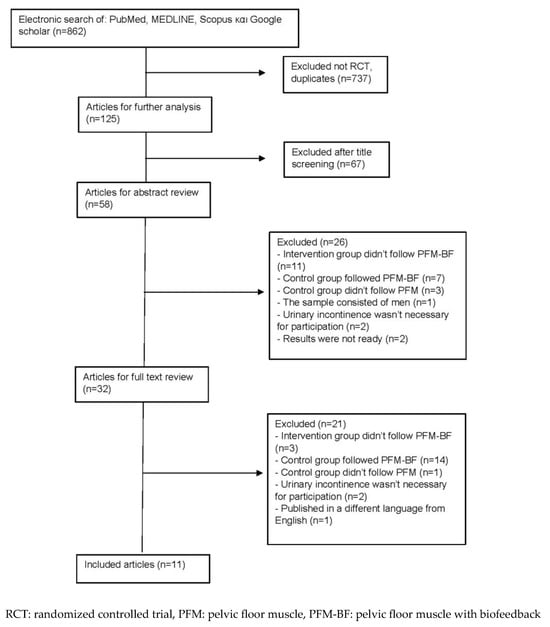 However, these studies are restricted to women with stress urinary incontinence (SUI) and, as a result, these conclusions cannot be generalized to other types of urinary incontinence (such as urge or mixed urinary incontinence). Furthermore, in Nunes et al.’s (2018) systematic review [21], not all of the included studies compared PFM exercises with BF to PFM exercise without BF, as some group interventions consisted of electrical stimulation, kinesthetic training, etc., while other comparative groups included no training at all. Thus, it is not clear whether PFM exercises with BF are better than isolated PFM exercises (without BF). In addition, outcomes such as the endurance and functionality of the pelvic floor muscles, satisfaction and commitment to the treatment have not been explored [21]. No other systematic review was found that clearly investigated, according to the above, the effectiveness of PFM exercises in combination with BF training for the treatment of urinary incontinence across women. Thus, this area merits further research.