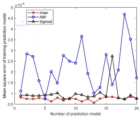 Mean square error distribution of 20 training prediction models under different kernel functions.