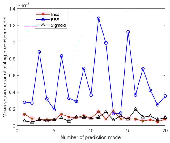 Mean square error distribution of 20 testing prediction models under different kernel functions.