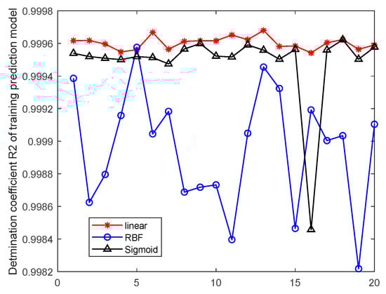 To effectively evaluate the performance of SVR prediction models, we designed SVR prediction models based on linear kernel, radial basis kernel, and Sigmoid kernel, respectively, under the condition that other parameters were kept constant. The evaluation indexes given by Formulas (21) and (22) were used to evaluate the performance of different kernel function SVR prediction models. The smaller the mean squared error E, the better the performance of the SVR prediction model. The closer the determined coefficients were to the value 1, the better the SVR prediction model. Otherwise, the SVR prediction model performed worse. It can be seen from Figure 3 and Figure 4 that the mean square errors of the SVR prediction model based on linear kernel function and the SVR prediction model based on Sigmoid kernel function were stable and smaller, while the mean square error of the SVR prediction model based on RBF kernel function fluctuated greatly and the average value was larger. Similarly, it can be seen from Figure 5 and Figure 6 that the SVR prediction model based on the linear kernel function and the SVR prediction model based on the Sigmoid kernel function were both stable and closer to 1 than the SVR prediction model based on the RBF kernel function in terms of the evaluation of the determined coefficients. It can be seen that the SVR prediction model based on linear kernel function and the SVR prediction model based on Sigmoid kernel function were superior to the SVR prediction model based on RBF kernel function in the evaluation of the two indexes, and there was little difference between the SVR prediction model based on linear kernel function and the SVR prediction model based on Sigmoid kernel function in the rating convenience of these two indexes.